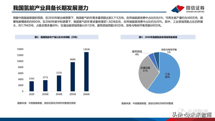 根据中国氢能联盟的预测,在2030年碳达峰愿景下,我国氢气的年需求量预期达到3,715万吨,在终端能源消费中占比约为5%;可再生氢产量约为500万吨,部署电解槽装机约80GW。在2060年碳中和愿景下,我国氢气的年需求量将增至1.3亿吨左右,在终端能源消费中占比约为20%。其中,工业领域用氢占比仍然最大,约7,794万吨,占氢总需求量60%;交通运输领域用氢4,051万吨,建筑领域用氢585万吨,发电与电网平衡用氢600万吨。