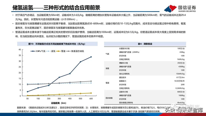 对于高压气态储运,当运输距离为50km时,运输成本为3.6元/kg,随着距离的增加长管拖车运输成本大幅上升,当运输距离为500km时,氢气的运输成本达到29.4元/kg。因此,长管拖车只适合短距离运输(小于200km)。固态储氢车与液氢槽罐车运氢成本对距离不敏感,当加氢站距离氢源点50-600km时,运输价格约在10-13元/kg范围内,成本变动与储运氢过程中耗电费用,载氢量有关,在长距离运输下,固态储氢车与液氢罐车都具备成本优势。管道运氢成本主要来源于与输送距离正相关的管材折旧及维护费用,当输送距离为100km时,运氢成本仅为0.5元/kg。但管道运氢成本很大程度上受到需求端的影响,在当前加氢站尚未普及、站点较为分散的情况下,管道运氢的成本优势并不明显。