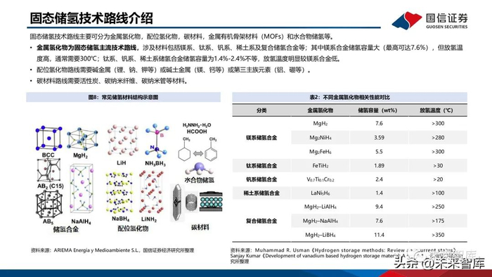 固态储氢技术路线主要可分为金属氢化物,配位氢化物,碳材料,金属有机骨架材料(MOFs)和水合物储氢等。金属氢化物为固态储氢主流技术路线,涉及材料包括镁系、钛系、钒系、稀土系及复合储氢合金等;其中镁系合金储氢容量大(最高可达7.6%),但放氢温度高,通常需要300℃;钛系、钒系、稀土系储氢合金储氢容量为1.4%-2.4%不等,放氢温度明显较镁系合金低。配位氢化物路线需要碱金属(锂、钠、钾等)或碱土金属(镁、钙等)或第三主族元素(铝、硼等)。碳材料路线需要活性炭、碳纳米纤维、碳纳米管等材料。