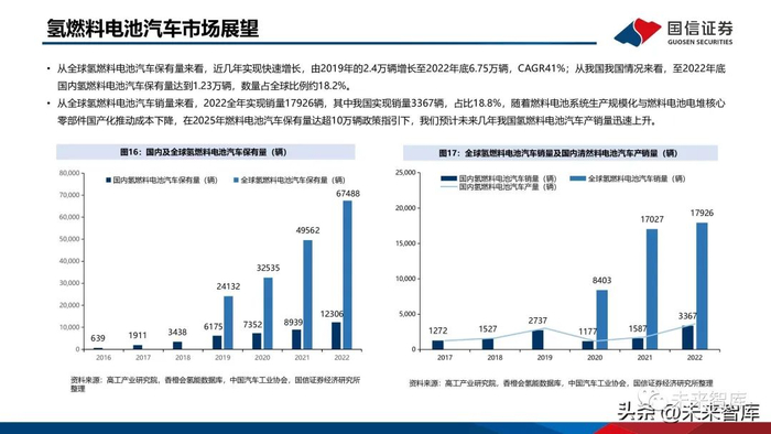从全球氢燃料电池汽车保有量来看,近几年实现快速增长,由2019年的2.4万辆增长至2022年底6.75万辆,CAGR41%;从我国我国情况来看,至2022年底国内氢燃料电池汽车保有量达到1.23万辆,数量占全球比例约18.2%。
