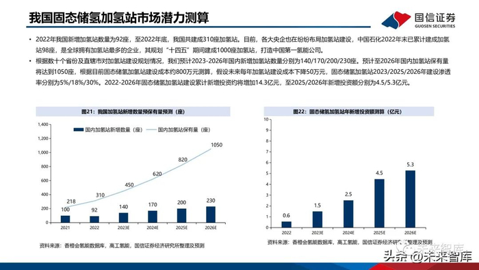 固态储氢技术应用前景广阔。1)车载储氢环节,伴随氢燃料电池汽车的推广和车载固态储氢系统成本下降,固态储氢系统市场空间将会打开,我们预计车载固态储氢瓶2030年市场规模突破百亿元;2)加氢站环节,固态储氢相较于高压气态和液态储氢不需要压缩机或液化装置即可完成充氢,在加氢站建设成本上较低,具备较好的经济性,我们估计当前固态储氢加氢站整体成本约为800万元,我们预计2022-2026年固态储氢加氢站建设累计新增投资约将增加14.3亿元,至2025/2026年新增投资额分别为4.5/5.3亿元;3)其他领域:如分布式供能,通信基站的备用电源,电力调峰电站等,氢储能的存储规模更大,存储时间更长可以满足长周期、大容量储能要求,同时固态储氢安全性强,运输灵活性高,在长时储能领域有广泛应用空间。
