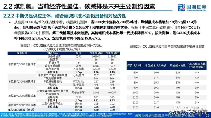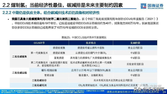 从应用CCUS技术的经济性来看,根据我们测算,当5500大卡煤价在700元/吨时,煤制氢成本将增加7.3元/kg至17.4元 /kg,但相较天然气制氢(天然气价格>2.5元/方)和电解水制氢仍有优势。根据《中国二氧化碳捕集利用与封存(CCUS) 年度报告(2021)》预测,第二代捕集技术突破后,其能耗和成本将比第一代技术降低30%,按此测算,则CCUS技术成本 将下降30%至5.6元/kg,煤制氢成本将下降至15.8元/kg。