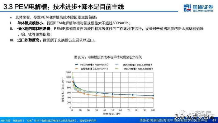 PEM制氢处于商业化初期,相较碱性电解水,制约当前PEM电解水制氢大规模商用的核心是技术成熟度不够。据高工 氢电网和《中国氢能与燃料电池产业年度蓝皮书2022》报道,碱性电解槽单槽产能最大已达2500Nm³/h,1000Nm³/h 产品已规模化应用,而我国PEM电解槽制氢规模最大不超过500Nm³/h。反映到经济性上则是PEM 电解水制氢技术目前设备成本较高,单位成本是碱性电解槽的4-5倍。据高工氢电网,碱性 电解槽价格在1500-2500元/kW;而国内PEM电解槽整体的价格高达7000-12000元/kW。