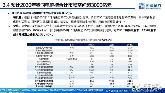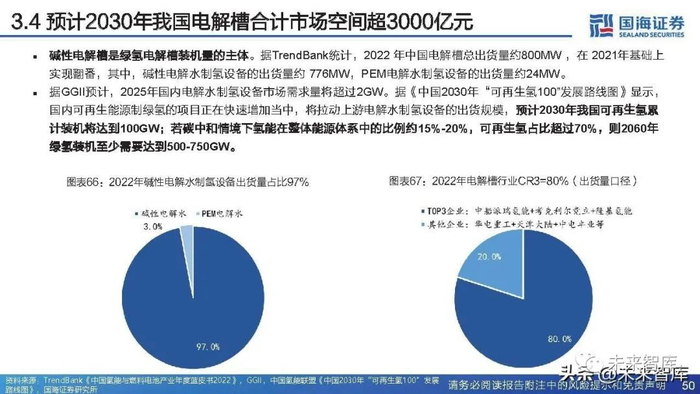 碱性电解槽是绿氢电解槽装机量的主体。据TrendBank统计,2022 年中国电解槽总出货量约800MW ,在 2021年基础上 实现翻番,其中,碱性电解水制氢设备的出货量约 776MW,PEM电解水制氢设备的出货量约24MW。据GGII预计,2025年国内电解水制氢设备市场需求量将超过2GW。据《中国2030年“可再生氢100”发展路线图》显示, 国内可再生能源制绿氢的项目正在快速增加当中,将拉动上游电解水制氢设备的出货规模,预计2030年我国可再生氢累 计装机将达到100GW;若碳中和情境下氢能在整体能源体系中的比例约15%-20%,可再生氢占比超过70%,则2060年 绿氢装机至少需要达到500-750GW。
