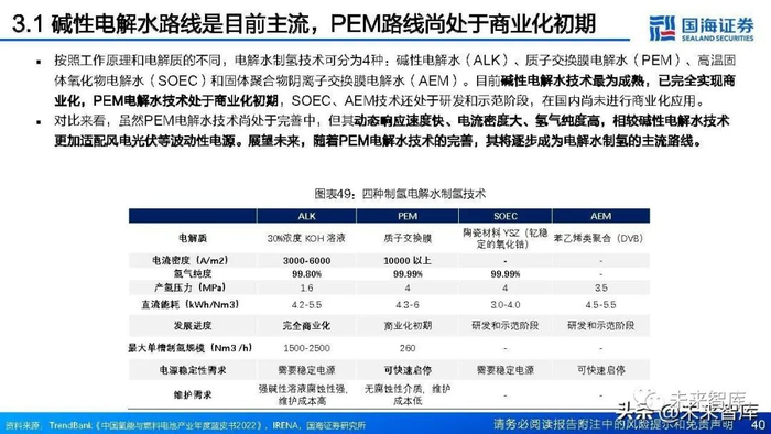 按照工作原理和电解质的不同,电解水制氢技术可分为4种:碱性电解水(ALK)、质子交换膜电解水(PEM)、高温固 体氧化物电解水(SOEC)和固体聚合物阴离子交换膜电解水(AEM)。目前碱性电解水技术最为成熟,已完全实现商 业化,PEM电解水技术处于商业化初期,SOEC、AEM技术还处于研发和示范阶段,在国内尚未进行商业化应用。对比来看,虽然PEM电解水技术尚处于完善中,但其动态响应速度快、电流密度大、氢气纯度高,相较碱性电解水技术 更加适配风电光伏等波动性电源。展望未来,随着PEM电解水技术的完善,其将逐步成为电解水制氢的主流路线。