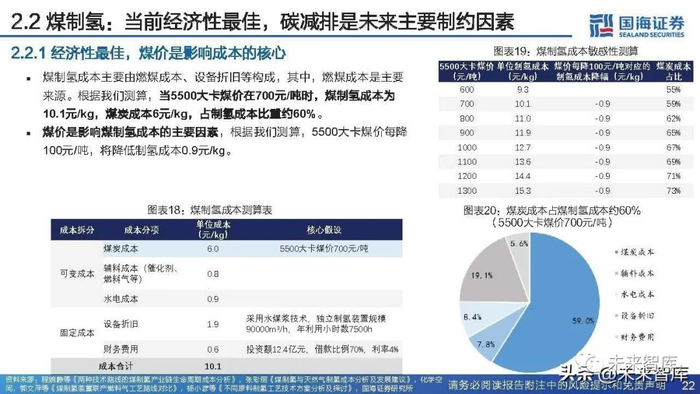 煤制氢成本主要由燃煤成本、设备折旧等构成,其中,燃煤成本是主要 来源。根据我们测算,当5500大卡煤价在700元/吨时,煤制氢成本为 10.1元/kg,煤炭成本6元/kg,占制氢成本比重约60%。煤价是影响煤制氢成本的主要因素,根据我们测算,5500大卡煤价每降 100元/吨,将降低制氢成本0.9元/kg。