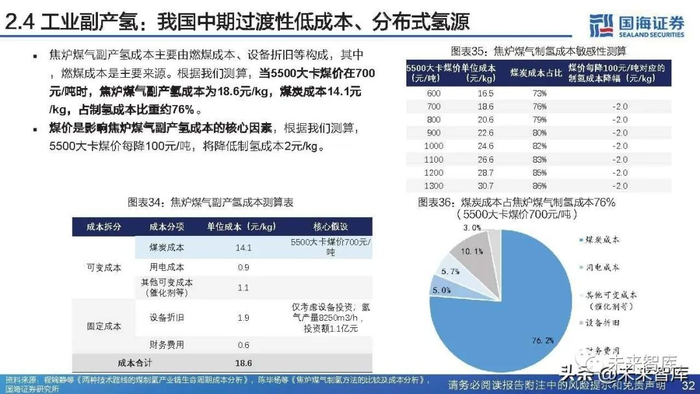 焦炉煤气副产氢成本主要由燃煤成本、设备折旧等构成,其中 ,燃煤成本是主要来源。根据我们测算,当5500大卡煤价在700 元/吨时,焦炉煤气副产氢成本为18.6元/kg,煤炭成本14.1元 /kg,占制氢成本比重约76%。煤价是影响焦炉煤气副产氢成本的核心因素,根据我们测算, 5500大卡煤价每降100元/吨,将降低制氢成本2元/kg。