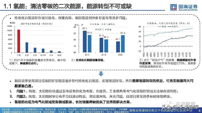 我国亟需使用清洁低碳的新型能源逐步替代传统化石能源,实现能源转型。然而随着能源转型的推进,可再生能源两大问 题逐渐凸显。I. 问题1:风能、太阳能往往通过发电设备转化为电能,在建筑、工业供热等电气化受限的领域无法被有效利用;II. 问题2:风能、太阳能时空分布不均且波动性强,常出现弃风、弃光问题,且跨日甚至跨季长时储能稀缺。氢能的出现为电气化领域受限领域脱碳、长时储能稀缺提供了优秀的解决方案。