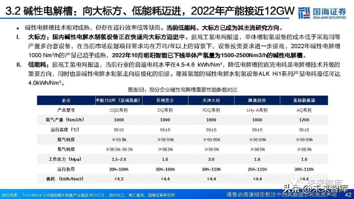 碱性电解槽技术相对成熟,但存在运行效率低等缺陷。当前低能耗、大标方已成为其主流研究方向。I. 大标方:国内碱性电解水制氢设备正在快速向大标方迈进中。据高工氢电网报道,单体槽制氢设备的成本低于采购同等 产量多台套设备,在当前市场规划项目需求均在万吨/年以上的背景下,设备投资要求进一步提高,2022年碱性电解槽 1000 Nm³/h的产品已趋于成熟,2022年10月明阳智能已下线单体产氢量为1500-2500Nm3/h的碱性电解槽。II. 低能耗:据高工氢电网报道,当前行业的普遍电耗水平在4.5-4.6 kWh/Nm³,降低电解槽的直流电耗是电解槽技术升级的 重要方向,同时也是碱性电解水制氢走向规模化的前提。隆基氢能的碱性电解水制氢设备ALK Hi1系列产品电耗最低可达 4.0kWh/Nm³。