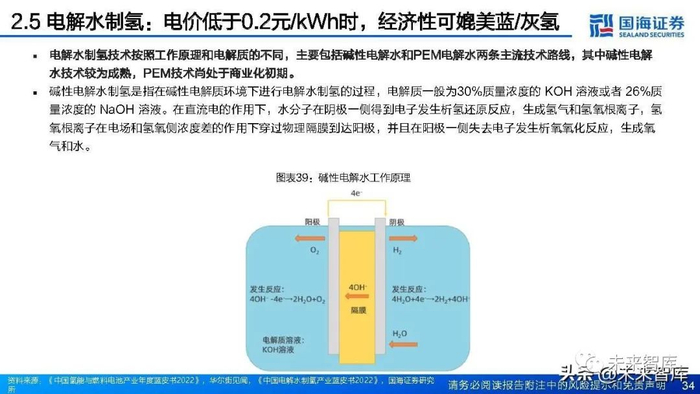 电解水制氢技术按照工作原理和电解质的不同,主要包括碱性电解水和PEM电解水两条主流技术路线,其中碱性电解 水技术较为成熟,PEM技术尚处于商业化初期。碱性电解水制氢是指在碱性电解质环境下进行电解水制氢的过程,电解质一般为30%质量浓度的 KOH 溶液或者 26%质 量浓度的 NaOH 溶液。在直流电的作用下,水分子在阴极一侧得到电子发生析氢还原反应,生成氢气和氢氧根离子,氢 氧根离子在电场和氢氧侧浓度差的作用下穿过物理隔膜到达阳极,并且在阳极一侧失去电子发生析氧氧化反应,生成氧 气和水。