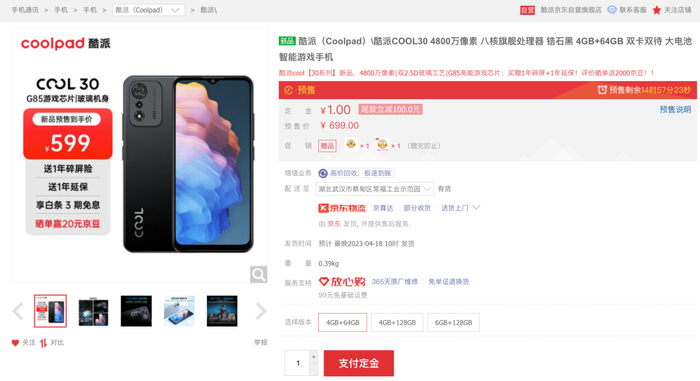 价格上,酷派COOL 30:4+64GB版售价699元,4+128GB版售价799元,6+128GB版售价899元,预售期间1元定金可抵100元,到手价599、699、799元。大家觉得这款百元入门机配置如何?