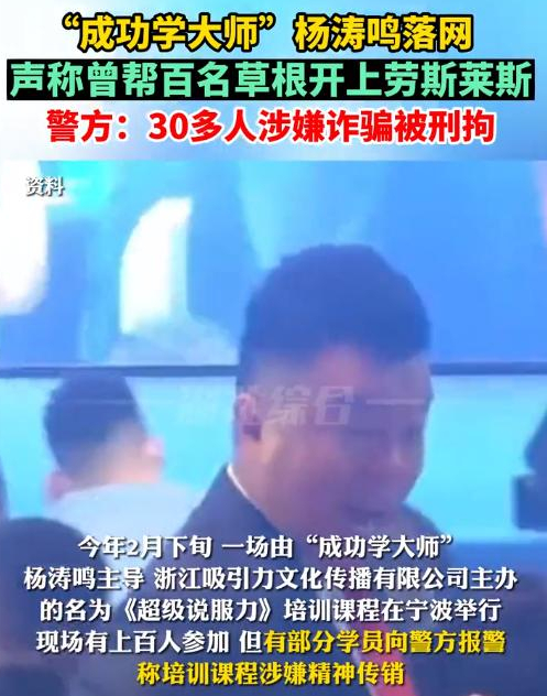 被抓的“成功学大师”名叫杨涛鸣,就是靠着无数难以考证的名头,自称“亚洲心灵潜能权威”,“亚洲第一潜能激励大师”,并吹嘘自己与世界名人的关系,将人们唬的团团转,最后掏钱买课,完成收割。