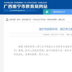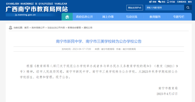 4月17日,南宁市教育局官网发布了《南宁市新民中学、南宁市三美学校转为公办学校的公告》,公告称:根据《教育部等八部门关于规范公办学校举办或者参与举办民办义务教育学校的通知》(教发〔2021〕9号)精神,经市人民政府同意,南宁市新民中学、南宁市三美学校转为公办学校。从2023年秋季学期起按公办学校招生、收费和管理。