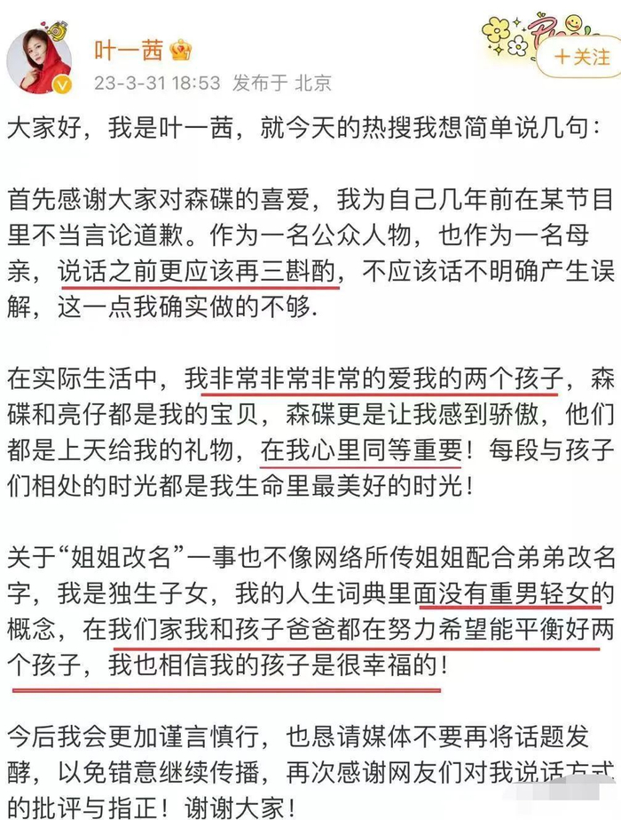眼看骂声愈烈,叶一茜连忙发长文否认,说非常非常非常爱两个孩子。