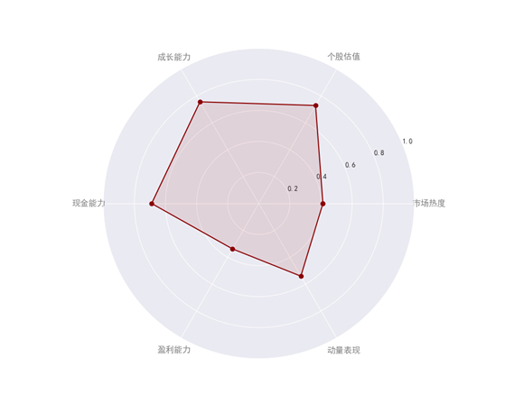 与同业相比,公司当前市场热度处于41.22%分位数,个股估值处于72.97%分位数,成长能力处于75.68%分位数,现金能力处于68.92%分位数,盈利能力处于33.78%分位数,以及动量表现处于54.05%分位数。