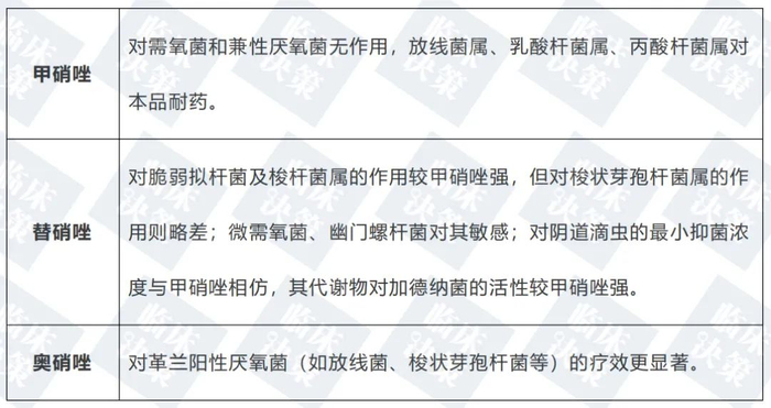 甲硝唑、替硝唑、奥硝唑均属于硝基咪唑类药物,其结构的共同特点是咪唑环上有硝基取代。硝基咪唑类药物具有抗厌氧菌谱广、杀菌作用强、价格较低,且疗效显著等优点,与其他抗菌药物联合应用于临床各个系统的厌氧菌与需氧菌混合感染。