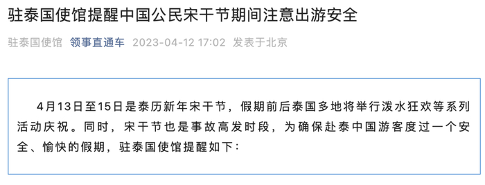 “领事直通车”微信公众号上周三(4月12日)发布《驻泰国使馆提醒中国公民宋干节期间注意出游安全》公告称,4月13日至15日是泰历新年宋干节,假期前后泰国多地将举行泼水狂欢等系列活动庆祝。同时,宋干节也是事故高发时段,为确保赴泰中国游客度过一个安全、愉快的假期,中国驻泰国大使馆提醒如下: