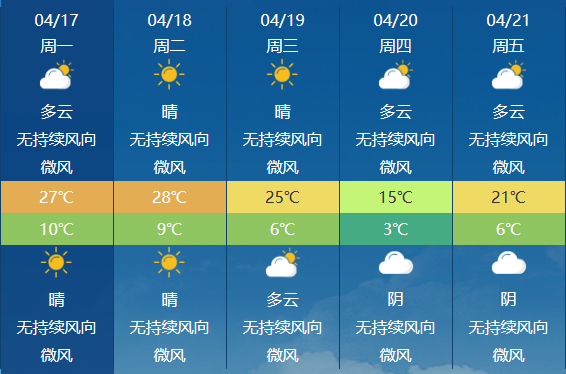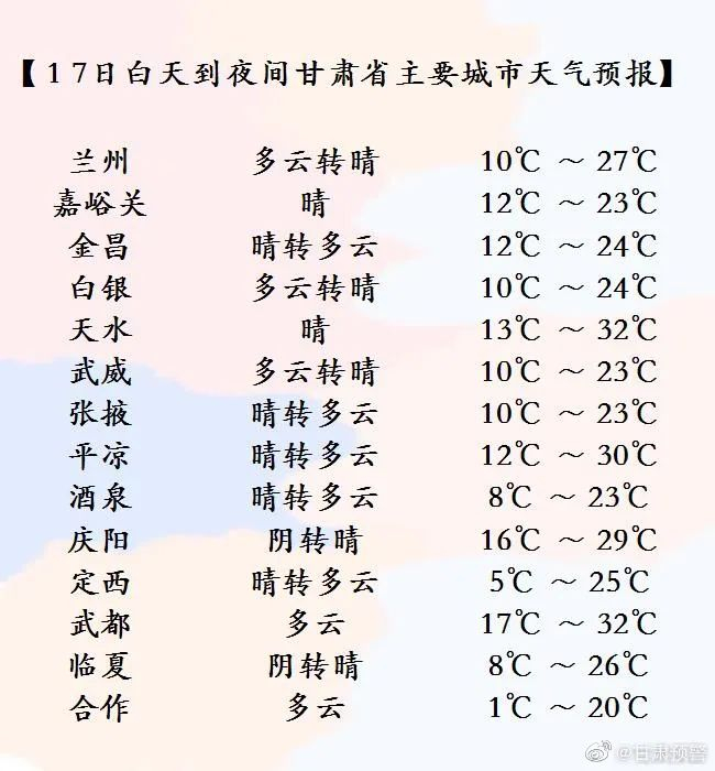 4月17日夜间到4月18日白天,酒泉市晴转多云,北部有5-6级偏北风,局部地方有沙尘;甘南州多云,局部地方阴有小雪(雨);省内其余地方晴或多云。
