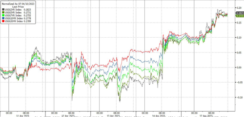其中,2年期美债收益率涨8.7个基点报4.207%,5年期美债收益率涨8.4个基点报3.704%,10年期美债收益率涨7.6个基点报3.605%,30年期美债收益率涨6.8个基点报3.813%。