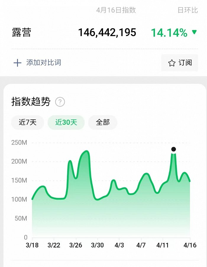 微信指数显示,“露营”关键词指数总体呈下降趋势,截至发稿当日,该关键词日环比还在下降,下降14.14%。