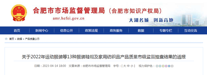 合肥市通报2022年运动服装等13种服装鞋帽及家用纺织品产品质量市级监督抽查结果