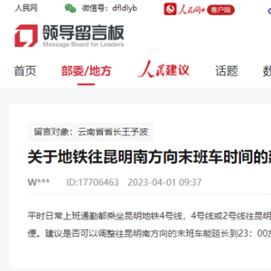 近日,有网友通过人民网“地方领导留言板”留言,“建议延长地铁往昆明南方向的末班车到23:00左右,或者断层式在23:00之后发出一辆往昆明南方向的末班车。”