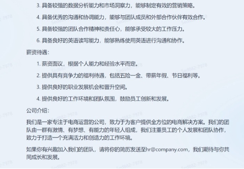 记者又提出让它撰写电商运营岗位的招聘JD(职位描述),「天工」3.5给出了非常详细的答复,涵盖职位名称、职位描述、任职要求、薪资待遇,甚至最后还附上了公司介绍和投递邮箱。不仅格式工整,内容也较为合理。