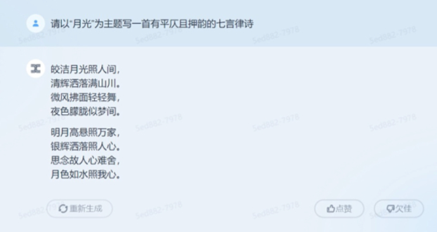 随后,记者让其以“月光”为主题写一首有平仄且押韵的七言律诗,「天工」3.5在几秒钟内便完成了。