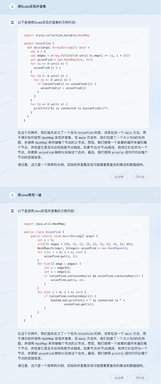 记者还尝试使用「天工」3.5写代码,提问:用Scala实现并查集,在得到回答后,又再次提问:用Java再写一遍。