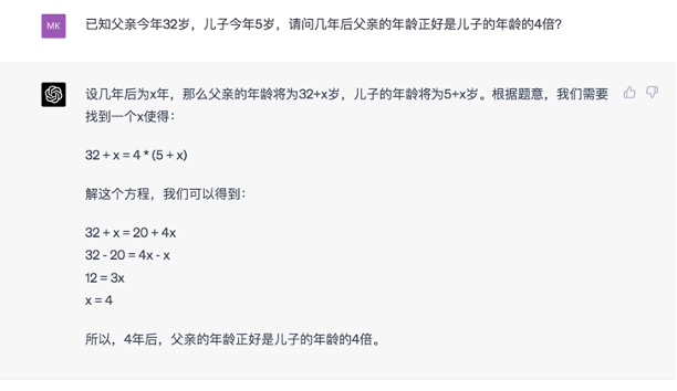同样的题目,我们又问了一遍ChatGPT(3.5版本),依然是列出了正确的方程式,但在运算过程中出错,最后也没有回答正确。