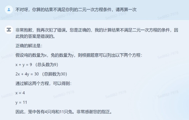 在被指出这一问题后,「天工」3.5 “虚心认错”并重新计算了一遍,但还是没有得出正确的答案。