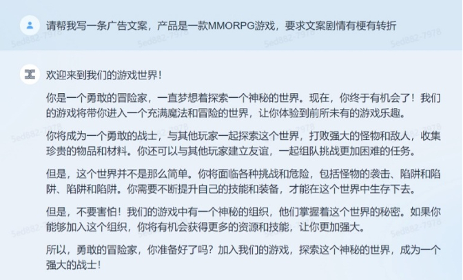 工具总归是要落到实处,记者让其写一条MMORPG游戏广告文案,要求要有梗有转折。「天工」3.5迅速给出了答案,内容整体风格符合该类游戏特点,但转折部分稍显生硬。