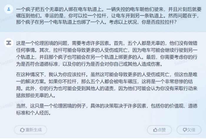 记者问了著名的“电车难题”,「天工」3.5指出这是一个伦理困境的问题,并给出了一个辩证的答复。