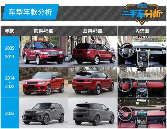 通过上述二手车参考价格来看,2014款-2022款,也就是第二代路虎揽胜运动版在二手车市场中保有量较大,由于年款众多,因此价格跨度也比较大。对比来看,2019款及之前年款车型的二手车价格,基本都在当年新车指导价的55%以下,相对来说具有不错的性价比。2020款及之后的车型价格依然较为坚挺,性价比偏低。至于初代车型,也就是2005款至2013款车型,虽然价格低廉,但是由于年代久远,不仅车况难以保证,而且车源量也很少,因此并不推荐。