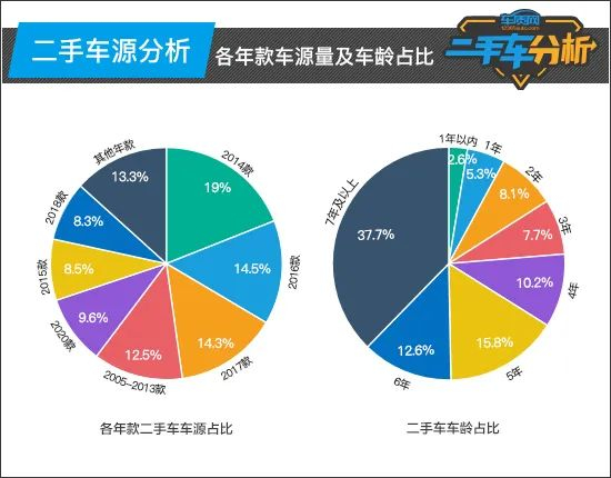 从各年款二手车车源占比和车龄占比来看,2014款车型相对较多,占比达到19%。而2016款和2017款车型也存在一部分比例,余下年款车型占比则相对较少。此外,7年及以上车龄的车型占比最高,5年、6年和4年的车型也存在一部分比例。