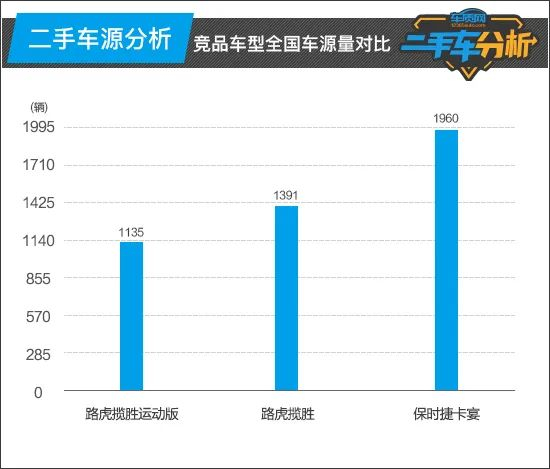 对比同级竞品,由于年款选择众多,因此路虎揽胜运动版二手车起步价相对来说较为亲民,不过还是要高于竞品保时捷卡宴;而在最高价方面,虽然路虎揽胜运动版也超过了百万,但仍明显低于同门大哥揽胜以及保时捷卡宴。