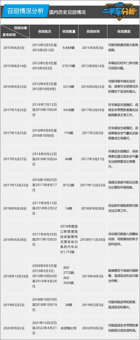 从目前掌握的数据来看,路虎揽胜运动版在国内发布召回公告共12次,涉及初代和第二代在内多个年款车型。根据资料来看,路虎揽胜运动版召回车辆数量庞大,并且涉及问题也五花八门,包括但不限于真空助力泵系统故障、车门问题、车辆熄火隐患、安全带张紧器问题、安全气囊展开问题以及液晶仪表无法显示等。在此,车质网要提醒广大消费者,在购买二手车时,需及时致电厂家客服或到4S店查询,确认该车辆此前是否已按召回方案进行处理,以免车辆依旧带“病”上路,存在安全隐患。