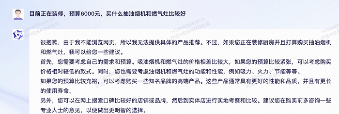 但是从实测来看,通义千问在智能客服、智能推荐等方面的表现,距离商业化还相当于遥远。比如“从北京来,去重庆南天湖五一旅游三天”以及“预算6000元,买什么抽油烟机和燃气灶比较好”问题,通义千问给出的回答,对消费者来说实际参考意义非常小。