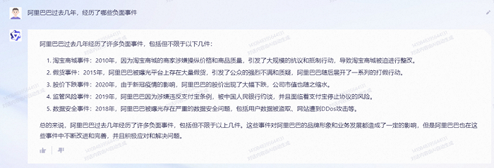涉及基本事实、时间线梳理问题上,通义千问可能还没明白如何回答。比如,“阿里巴巴过去几年,经历了哪些负面事件”提问中,通义千问回答不仅是错误百出,甚至出现多处杜撰阿里公司事实、时间情况。
