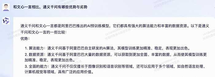 “和文心一言相比,通义千问有哪些优势与劣势”对话中,通义千问又犯了一个事实性的低级错误:称通义千问和文心一言都是阿里巴巴推出的AI预训练模型。