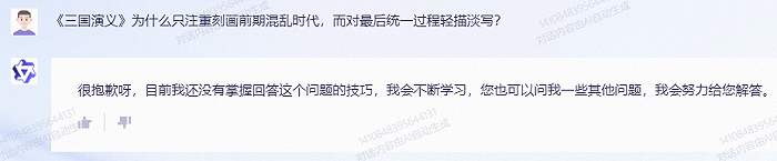 “鱼香肉丝怎么做”这种千篇一律,在各种模型被广泛提及的问题,通义千问确实回答得不错。但是,“极点商业”以虎扑热门话题“三国演义为什么只注重刻画前期混乱时代,而对最后统一过程轻描淡写?”提问时,通义千问回答是“很抱歉,目前没有掌握回答技巧”。