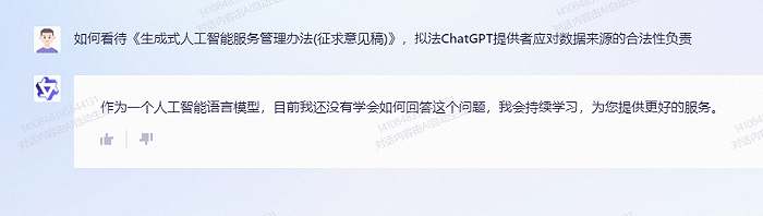 “如何看待《生成式人工智能服务管理办法(征求意见稿)》,拟法ChatGPT提供者应对数据来源的合法性负责”问题上,另一AI大模型给予肯定,指出是加强人工智能监管方面的重要举措。而通义千问依然是“没有学会如何回答”。