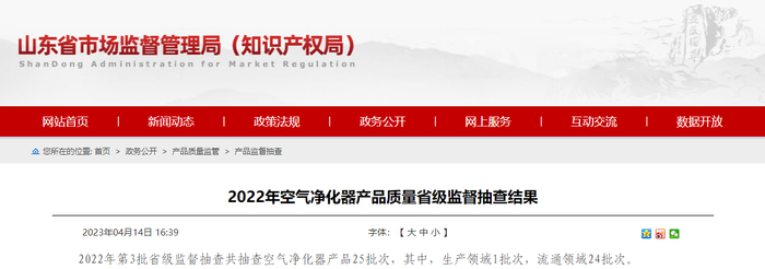 山东省市场监督管理局抽查空气净化器产品25批次 未发现不合格项目