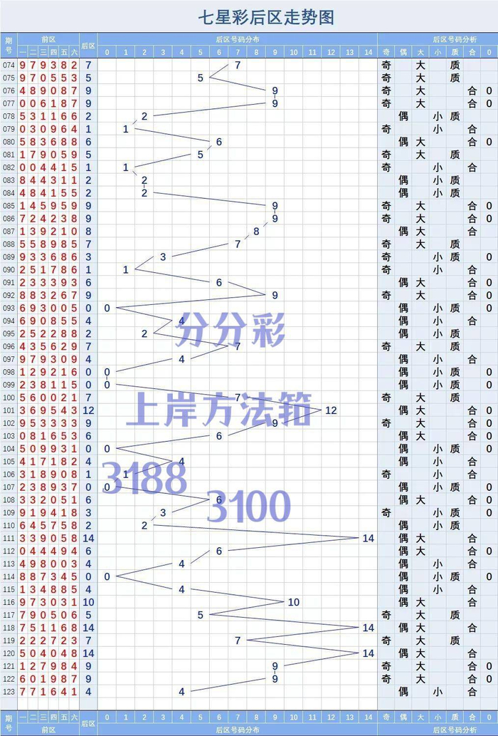 “分布图”就是标有开奖期数和中奖号码的那种“格子图”。它的最大优点就是直观,用符号代替数字,让人摆脱了某个具体数字的纠缠,站在较宏观的角度上去研究。使用分布图有两种基本方法:一是横向区间法,把30多个数字(如10、20、30)分成数个区间,在图上分隔开,这样,各区间数字出现的频率、分布情况一目了然,哪个区间何时走强何时走弱,都一清二楚。二是纵向“复印”法,中奖号码有冷有热,有些号码每隔数期就会出现,有时甚至几个号码又原封不动地出现在下一期的中奖号码中。这样就可以根据分布图,全部“复印”往期号码,也可以根据自己的判断进行部分“拷贝”。此外还有斜线、跳跃、连星等分析方法。