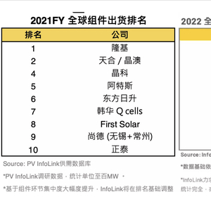 4月17日,行业资讯媒体InfoLink Consulting更新了2022年全球组件出货排名。TOP10组件商出货量约252 GW,同比增长166%。前十名中,多家公司的排名发生了变化。