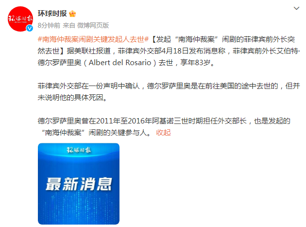 发起“南海仲裁案”闹剧的菲前外长突然去世,外媒:死于赴美途中