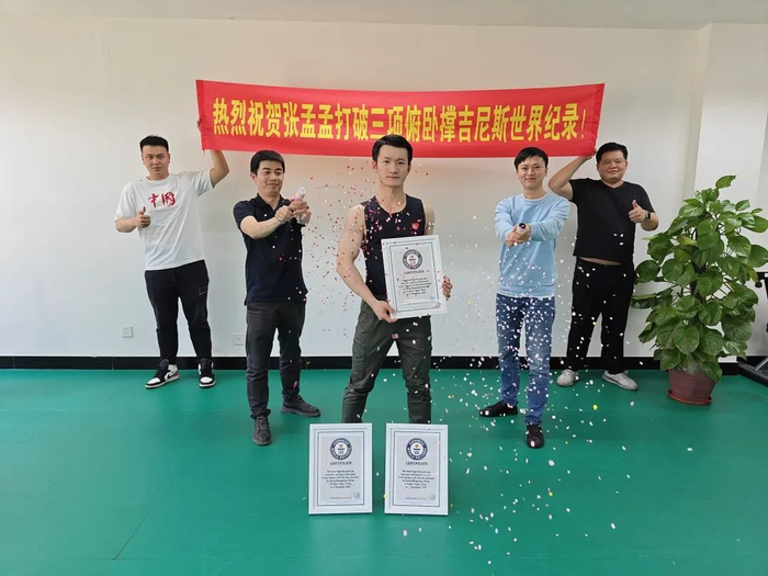 “2015年,我也曾挑战世界纪录,并成功,当时是一分钟80个单手连续俯卧撑,没有负重。”张孟孟说,自那次以后,他向更高的难度发起了挑战,开始负重训练,几乎是隔天就训练一次,每次3到4小时,练爆发力的同时还要做指力训练。据张孟孟自己估计,这十年,他至少做了200多万个俯卧撑。