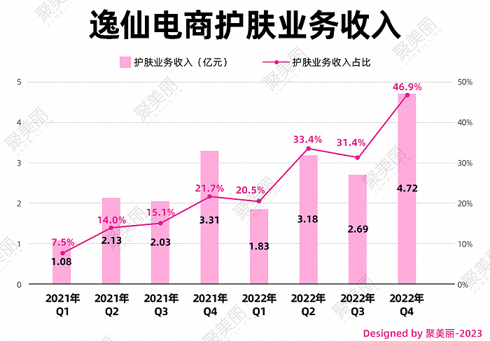 逸仙电商虽然并未具体披露各大品牌的具体数值,但是它们可以说是通过多品牌战略,成功实现从彩妆到护肤跨越的集团。2022年集团护肤品牌的净收入总额为12.4亿元,占总营收比例为33.5%,而在两年前,这个比例不到10%。其中Q4护肤占总营收比例高达到46.9%。