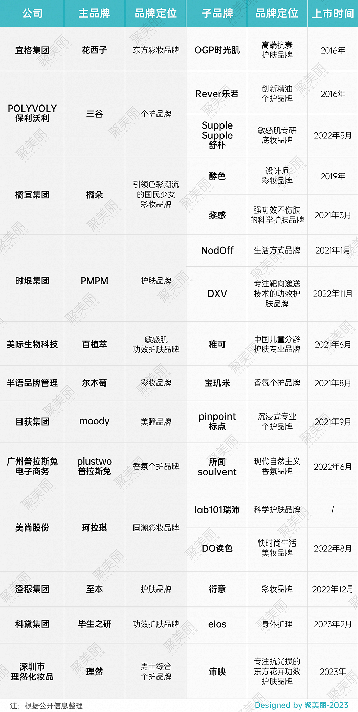 除了上市公司外,据聚美丽不完全统计,在未上市的化妆品企业中,也已有数十家企业在主品牌发展到一定阶段后,就开始布局第二、第三品牌,包括了目前较为头部的花西子、橘朵、珂拉琪、至本、PMPM、理然等。
