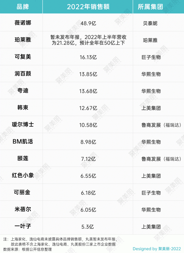 而就在前段时间,上海家化、华熙生物、贝泰妮、鲁商发展、逸仙电商、上美股份、巨子生物等一众本土美妆企业也都陆续交出2022年的成绩单。我们从单品牌销售额维度,梳理了这些国内上市美妆企业的品牌布局: